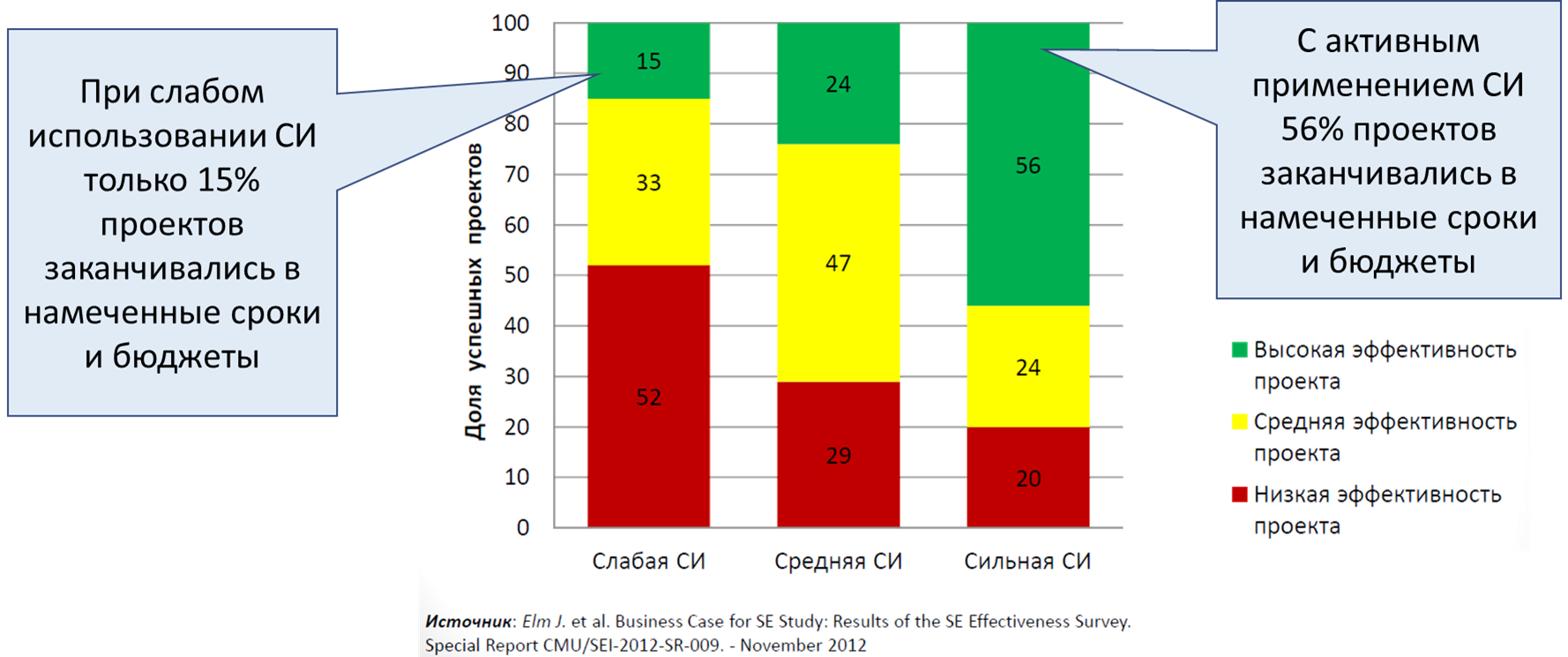 - в проектах, где системная инженерия применялось в наибольшей степени, в 57 % проекты заканчивались в намеченные сроки и бюджеты.