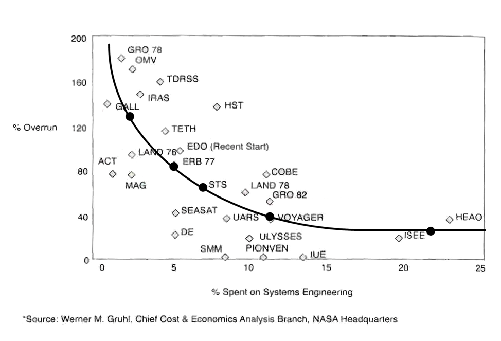 - При затратах на системную инженерию в 20% от стоимости проекта, перерасход по отдельным проектам составлял не более 40%, а значительна часть проектов завершалась без перерасходов.