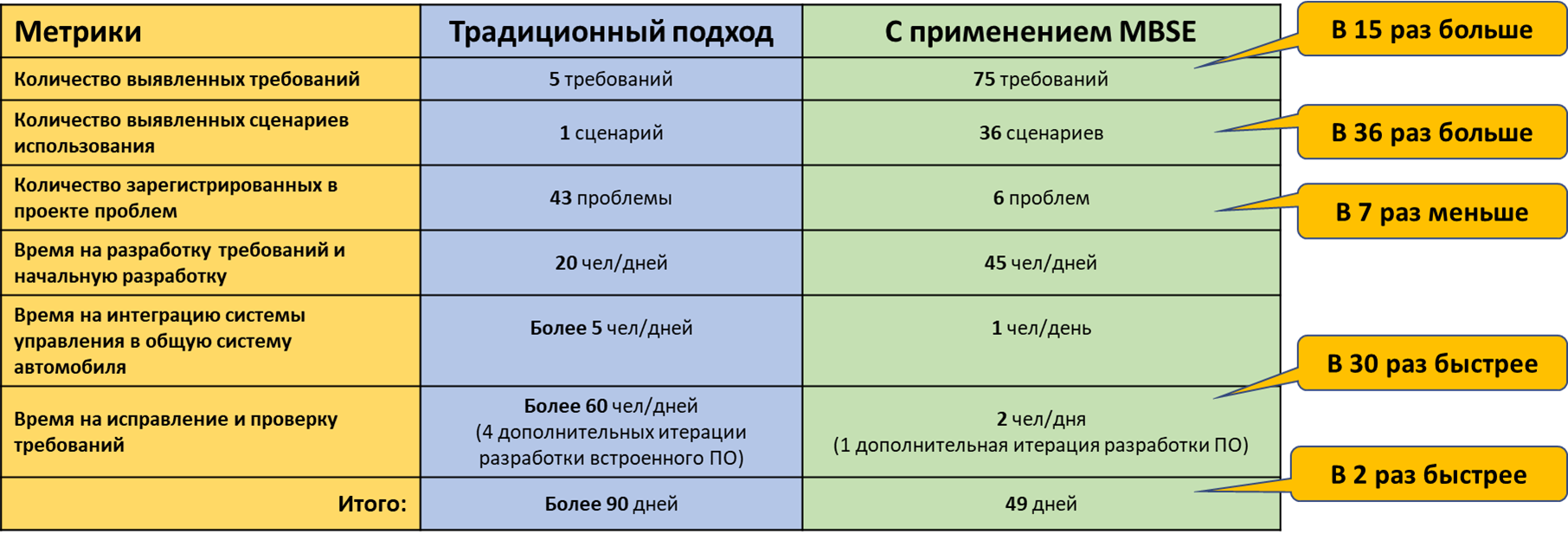 Результат пилотного проекта наглядно иллюстрирует, что при MBSE значительно возрастает трудоемкость на ранних стадиях проектирования (в текущем примере, при MBSE на разработку требований было потрачено 45 чел/дней, против 20 чел/дней при традиционном подходе), но при этом происходит сокращение ошибок ( в 7 раз меньше при MBSE) и достигается значительный выигрыш в общих срока проектирования (49 дней при MBSE, против 90 дней при традиционном подходе).