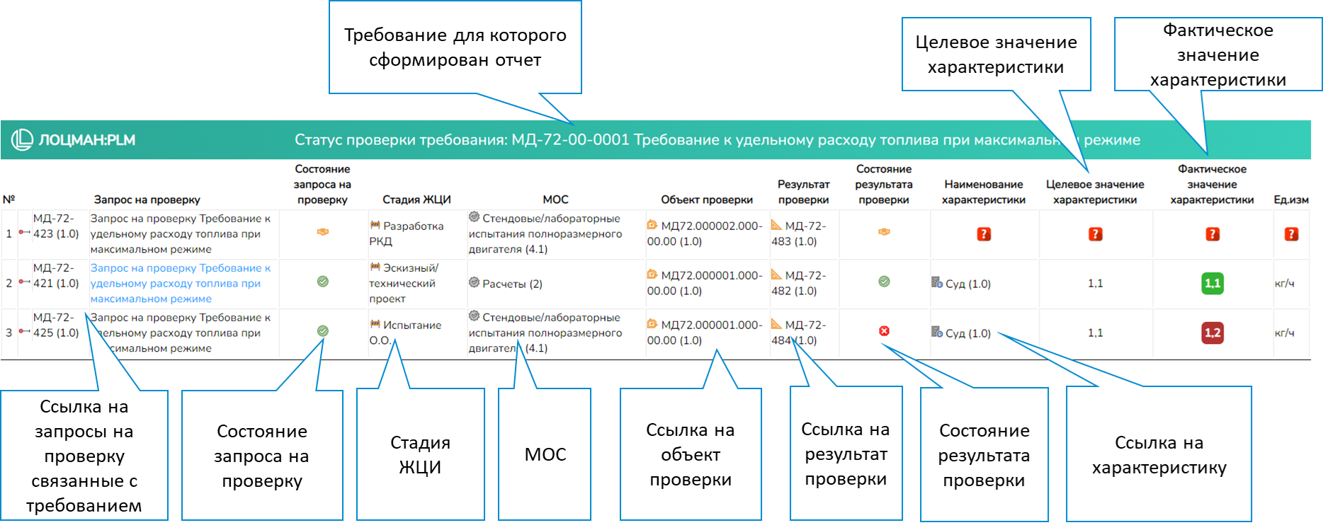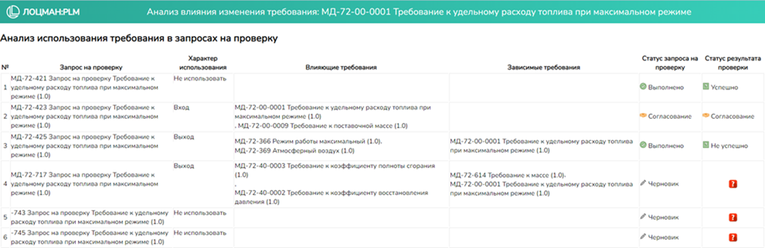 Отчет используется анализа выполнения требований связанных с проектными данными. Например, пользователь может сформировать отчет по сборочной единице и увидеть все ли связанные с ней требования подтверждены выполненными запросами на проверку и результатами проверки.