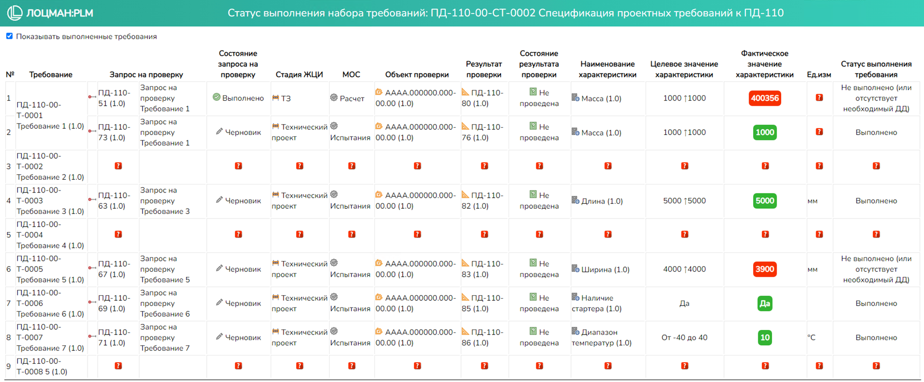 Отчет показывает информацию об актуальном состоянии выполнения конкретного требования.