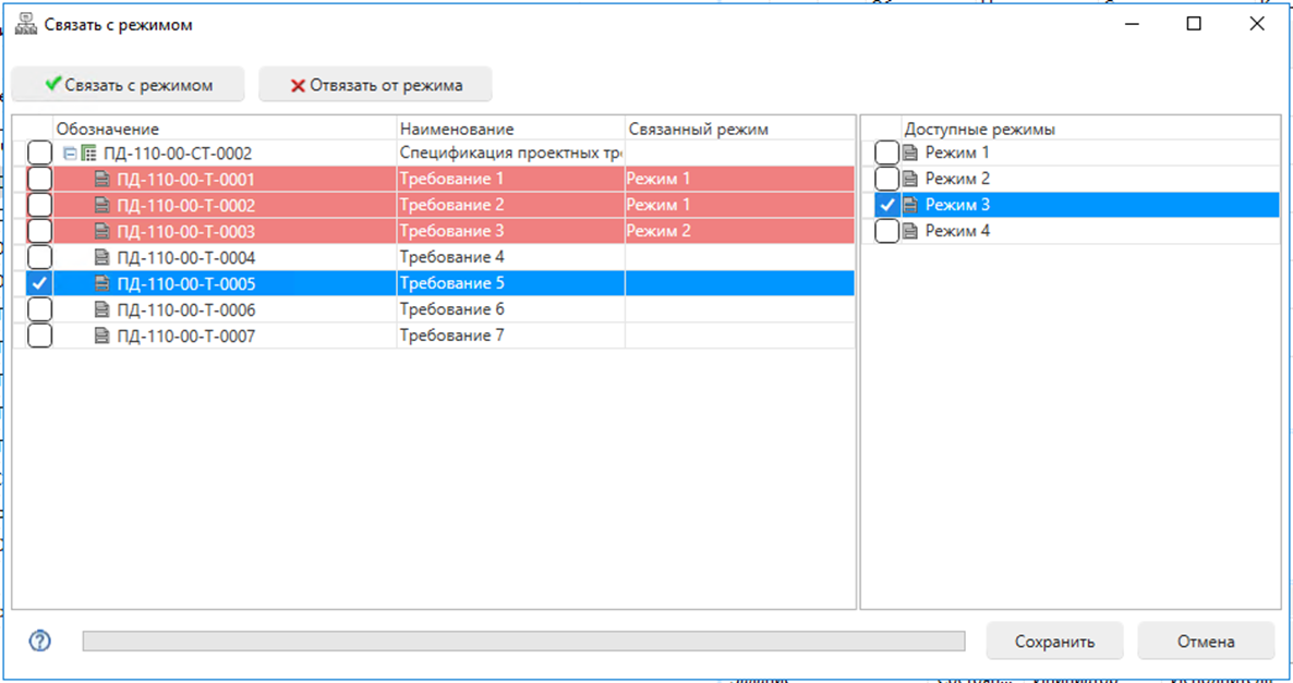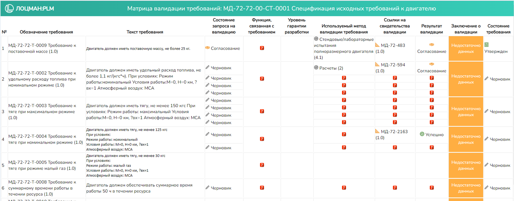 Отчет "Матрица верификации", отображает статус выполнения требований для выбранной спецификации требований.
