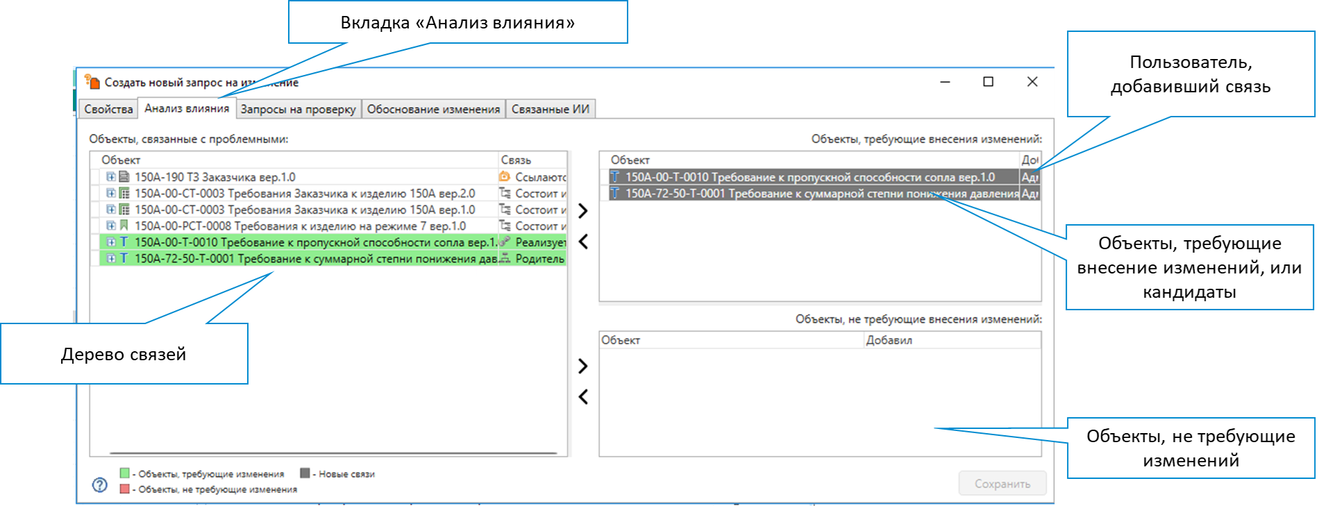 Функционал поддерживает комплексный процесс анализа влияния изменения требования: