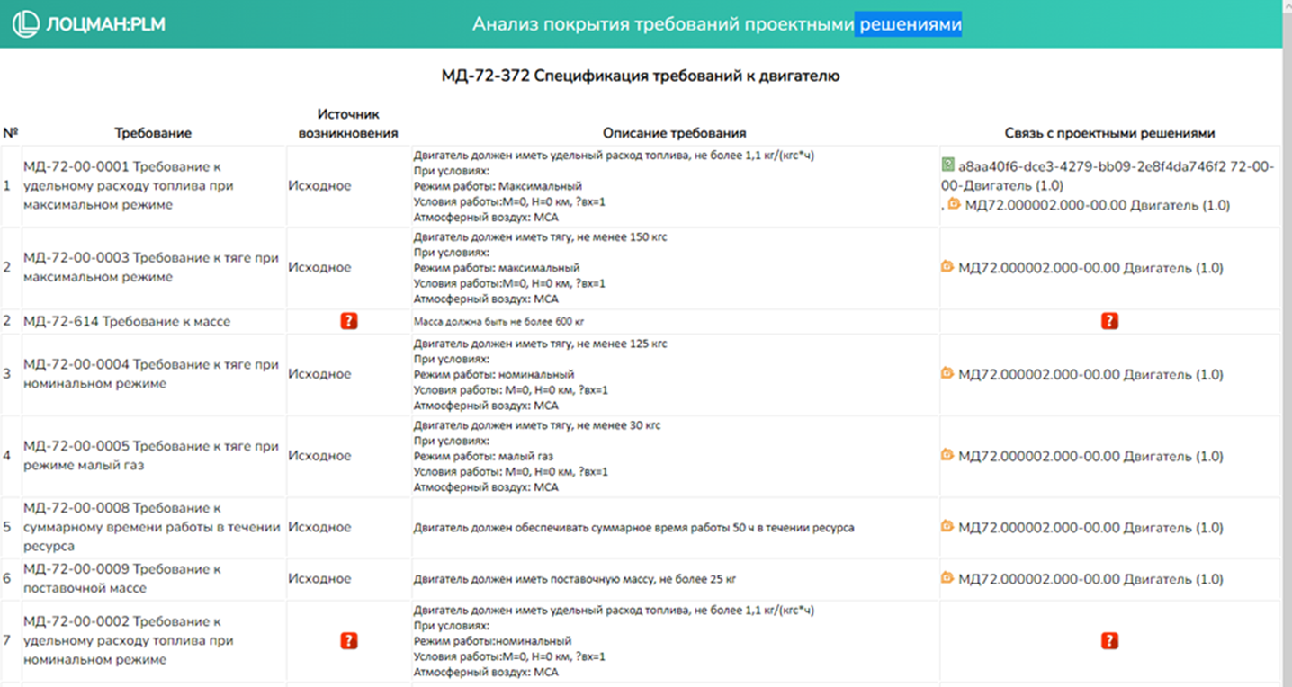 Отчет, по каждому требованию из выбранной спецификации показывают существующие трассировки с другими объектами ЛОЦМАН:PLM:- Обозначение связанного объекта;