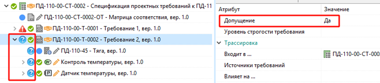 Для визуальной идентификации допущений требований безопасности используется дополнительная пиктограмма, отображаемая при наличии значения соответствующего атрибута требования.