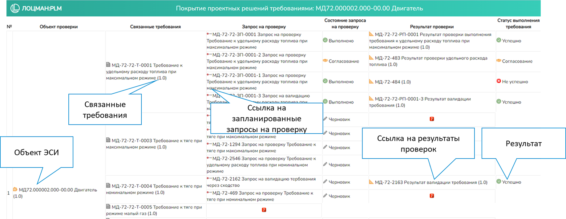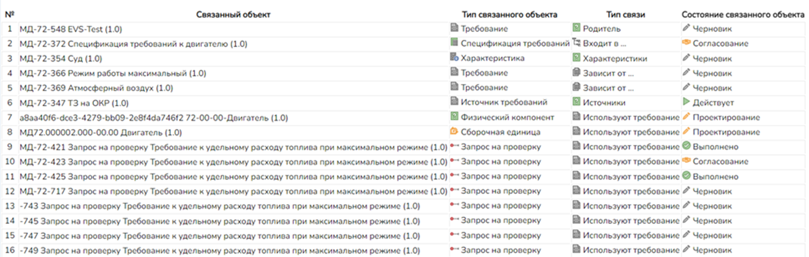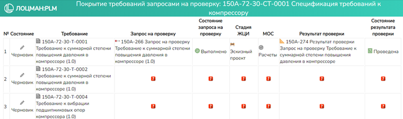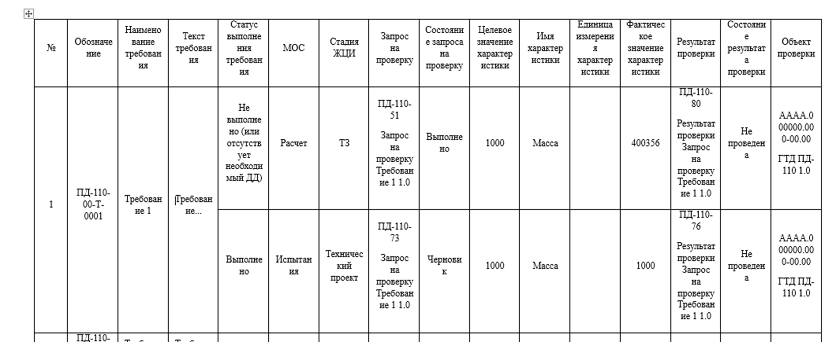 Отчет показывает требования имеющие или не имеющие связанные с ними запросы на проверку и результаты проверки. По каждому требованию, в виде отдельной ячейки отображается следующая информация:- Обозначение, наименование и номер версии объекта типа Запрос на проверку;