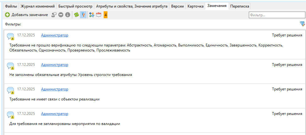 Сформированные системой замечания к объекту сохраняются на вкладке «Замечания».