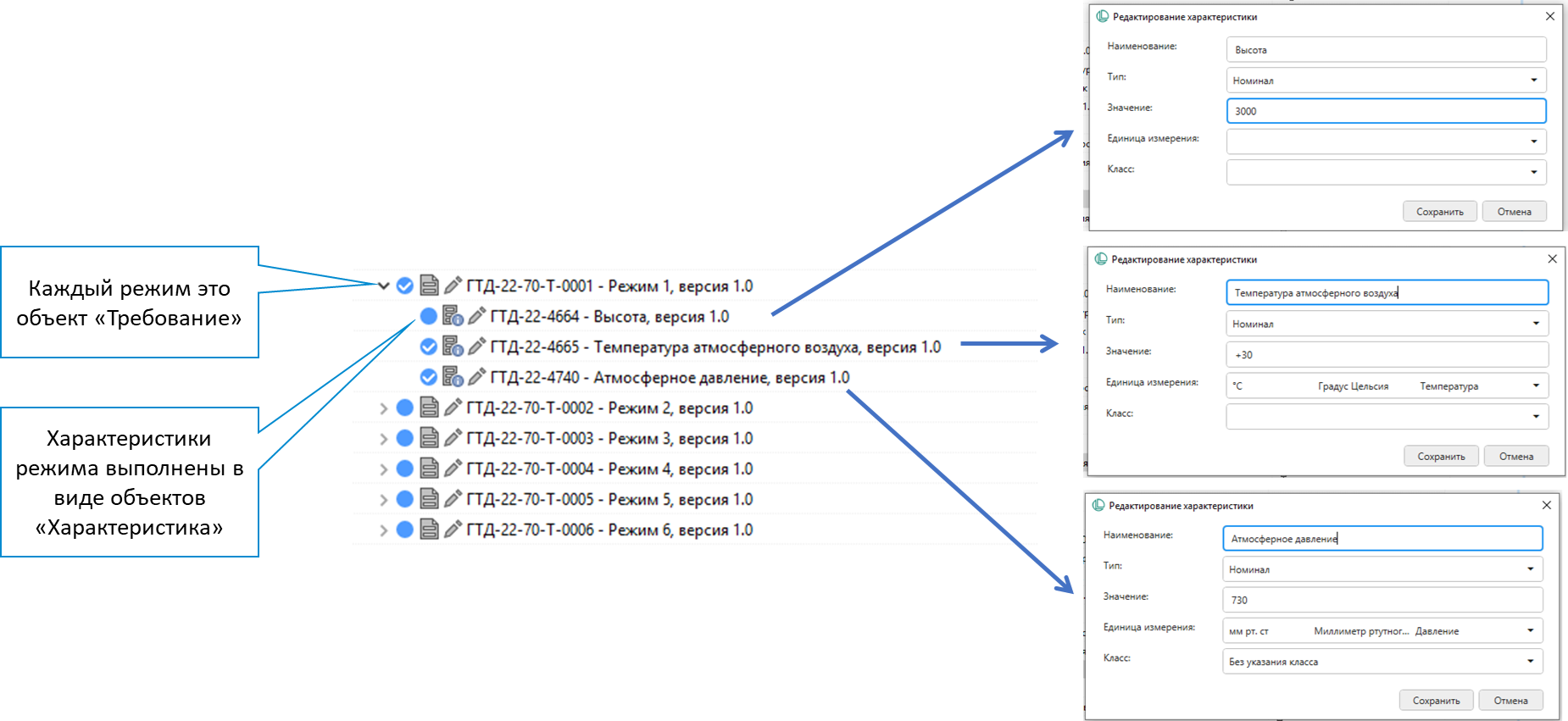 Условие (или режим) может быть представлено как одно требование и связанные с ней несколько характеристик.