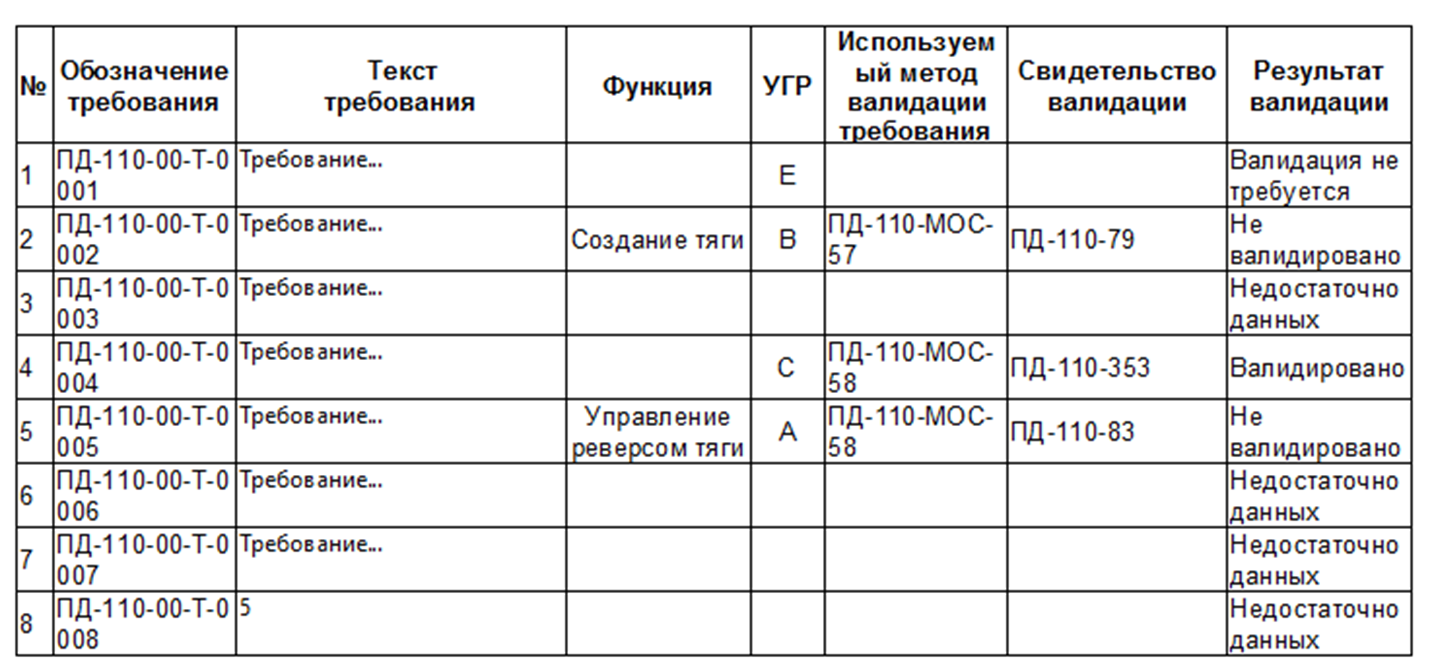 Отчет показывает статус валидации требования – состояние всех запланированных для требования запросов на валидацию и общий вывод по их выполнению.