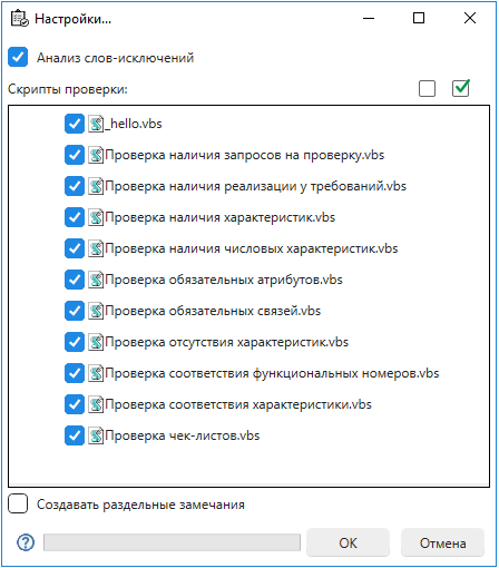 При запуске команды Проверка требований, предлагается сделать выбор перечня скриптов используемых для проверки требований.