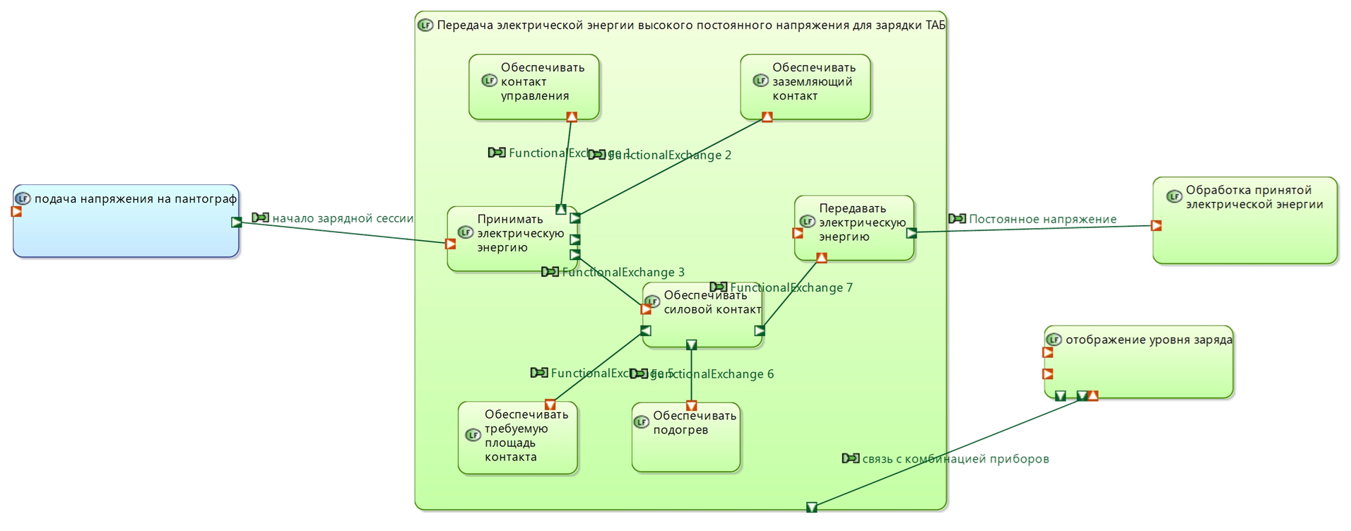 На рисунке ниже можно увидеть пример данных, которые могут содержаться в модели функций (приведен пример диаграммы декомпозиции функции на уровне логической архитектуры, разработанной по методу ARCADIA).