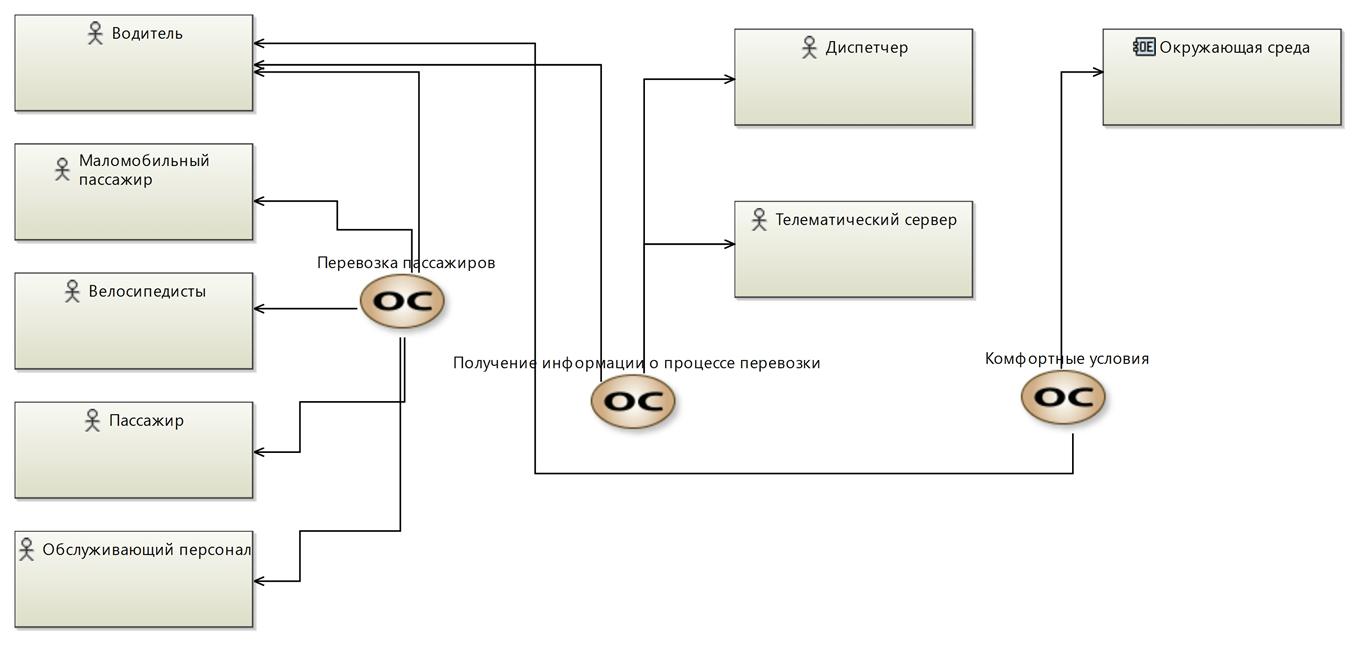 На рисунке ниже можно увидеть пример данных, содержащихся в модели эксплуатации, разработанной по методу ARCADIA (приведен пример диаграммы операционных возможностей проектируемой системы при взаимодействии с окружением).