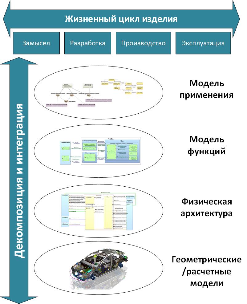 - Модели применяются как горизонтально, для поддержки жизненного цикла изделия, так и вертикально, для декомпозиции и интеграции в дисциплины реализации.